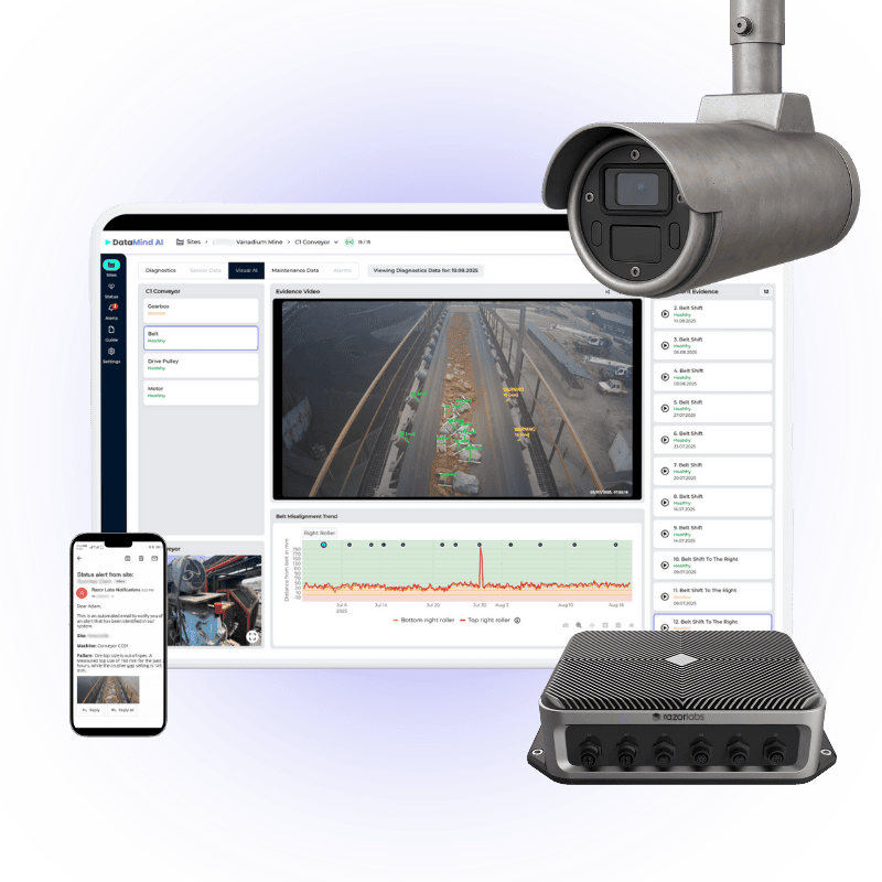 DataMind Visual AI™ is an AI-enabled monitoring solution that uses high-resolution industrial cameras and sensor fusion to deliver real-time visibility into material movement, equipment condition, and critical process health – across conveyors, crushers, feeders, and transfer zones.