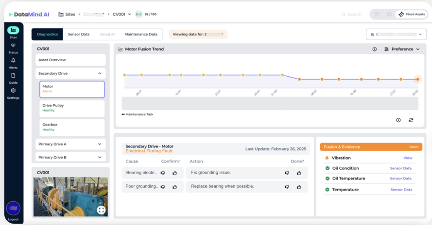 DataMind AI™ applied Sensor Fusion – combining vibration, tachometer, and motor current data – to detect mechanical faults in a noisy and highly variable conveyor environment. By isolating consistent operating modes, the system filtered out operational noise caused by changing loads, ore size, or belt dynamics – greatly reducing false positives and ensuring that vibration increases reflected real mechanical issues.