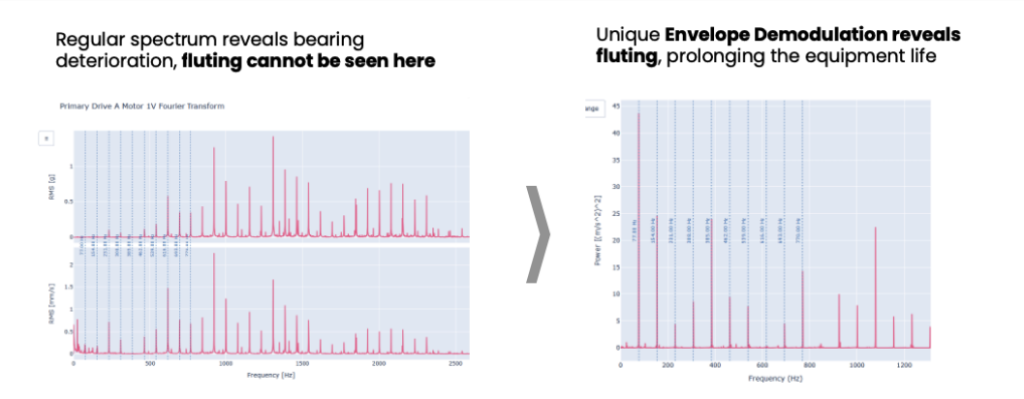 Envelope analysis removed high-frequency noise and revealed early-stage bearing degradation. While the standard spectrum showed general wear, envelope demodulation exposed distinct fluting patterns – a form of electrical discharge damage to the bearing surface, enabling accurate root cause diagnosis.